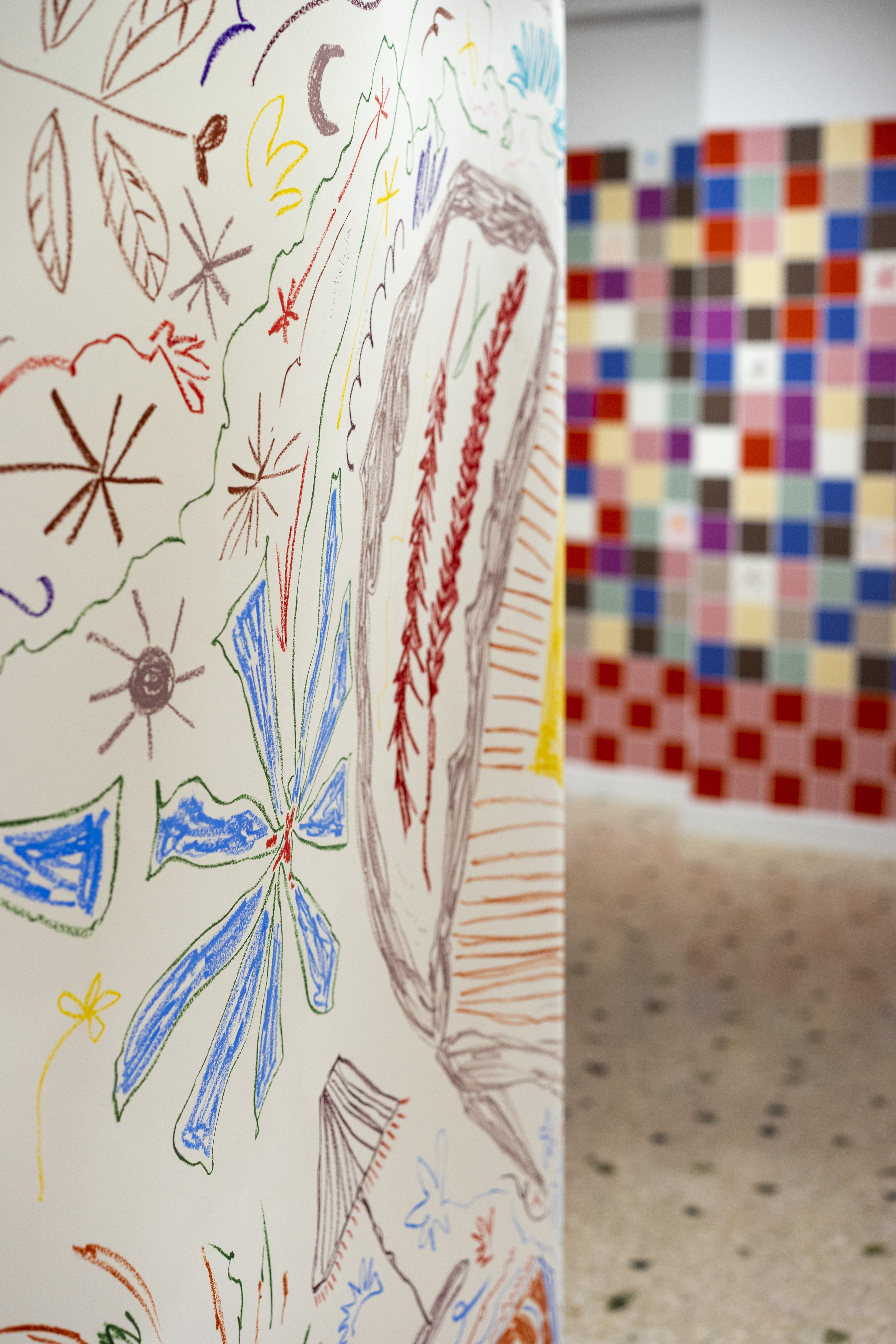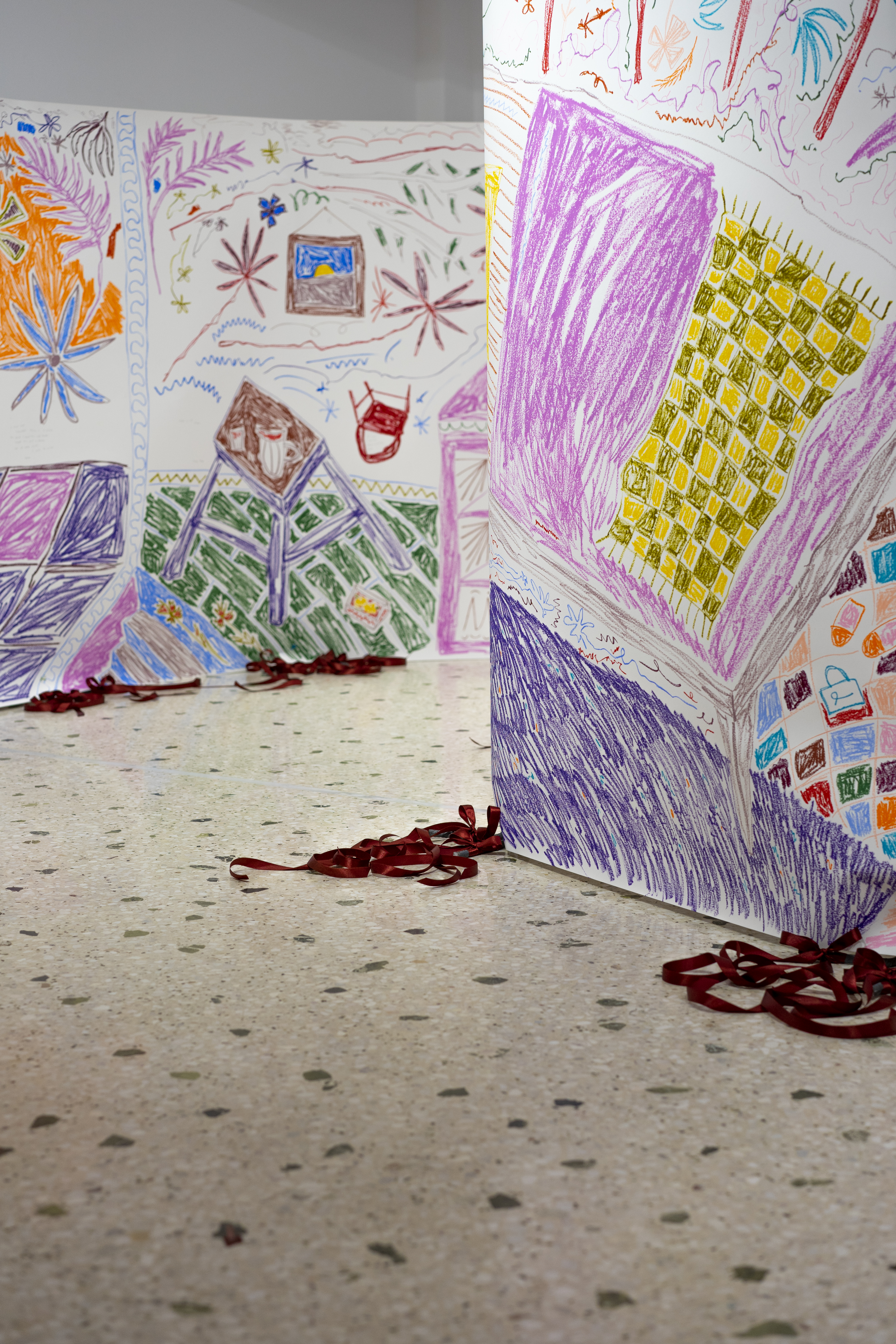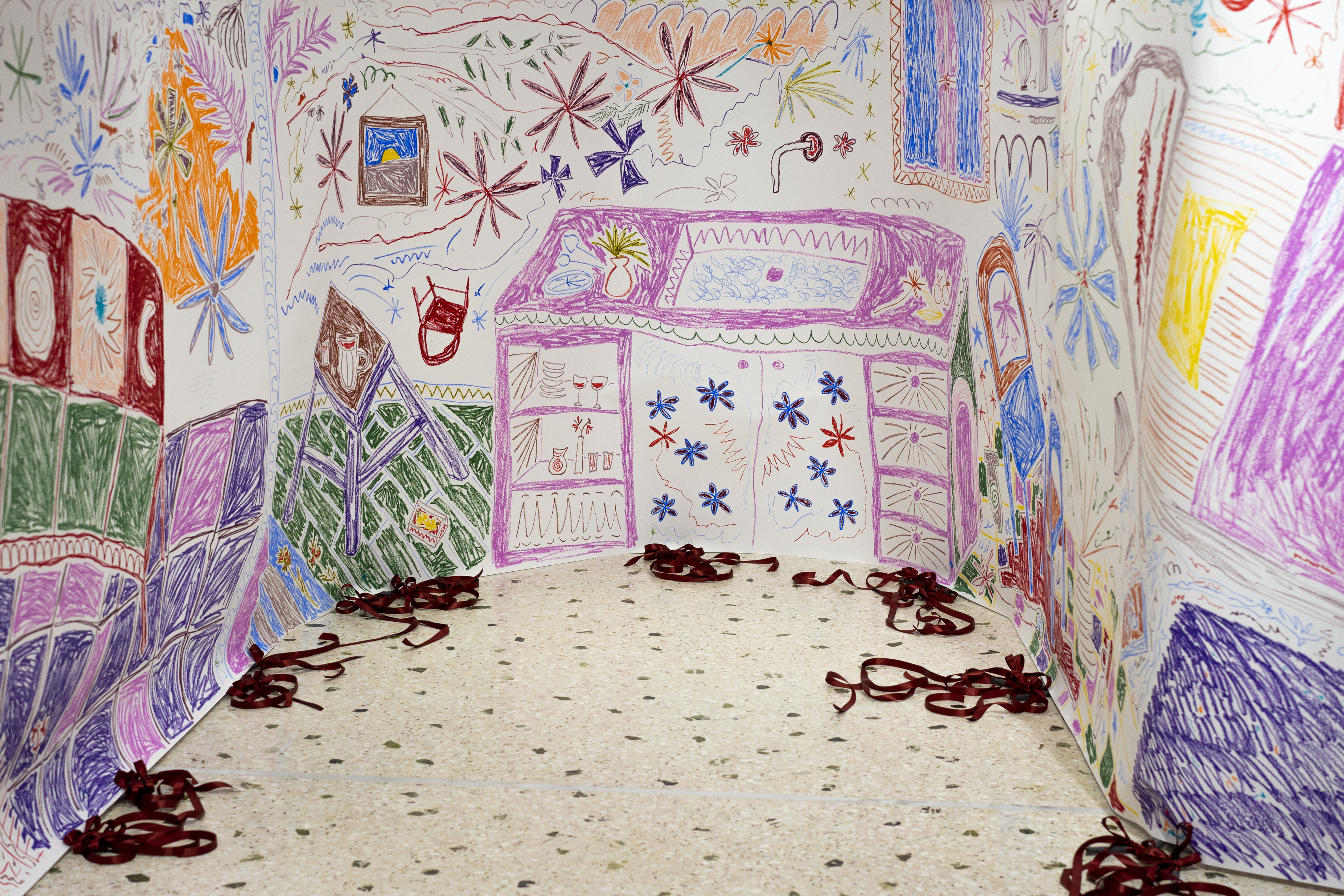 The installation transforms the space into a “house-canvas”: every wall is covered with paper, upon which the artist intervenes in situ with painterly imprints, topographies, bodies, and traces of energy. The environment is further activated by totem-like objects and installations that reference a woman’s daily relationship with the space she inhabits—or the space she has been compelled to inhabit. Womenhouse seeks to document and bring to light the complex experience of women’s everyday life within the domestic sphere. Through the painted imprints and wall topographies, visitors are invited to discern traces of presence, movement, and energy that reveal both freedom and constraint within the home.