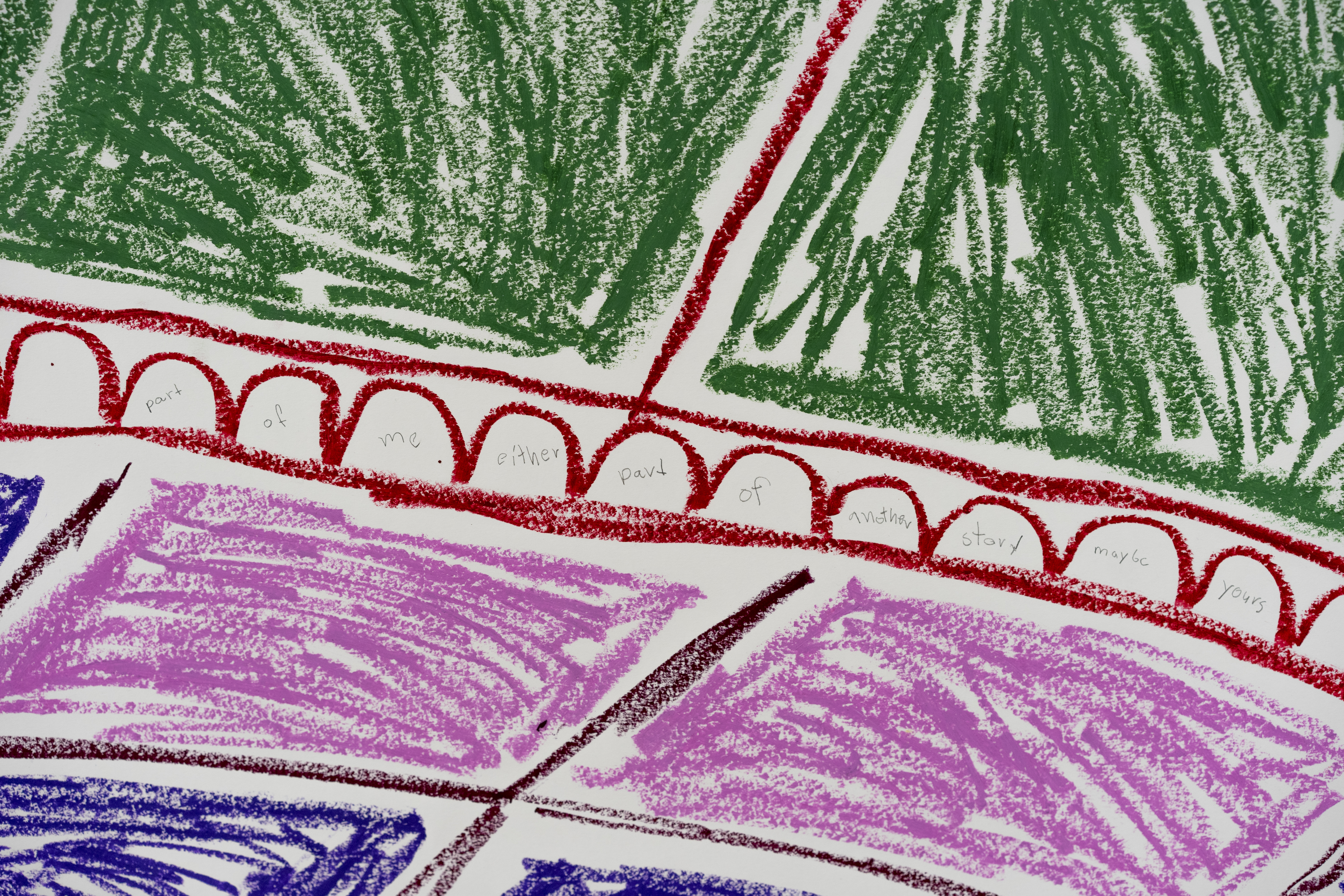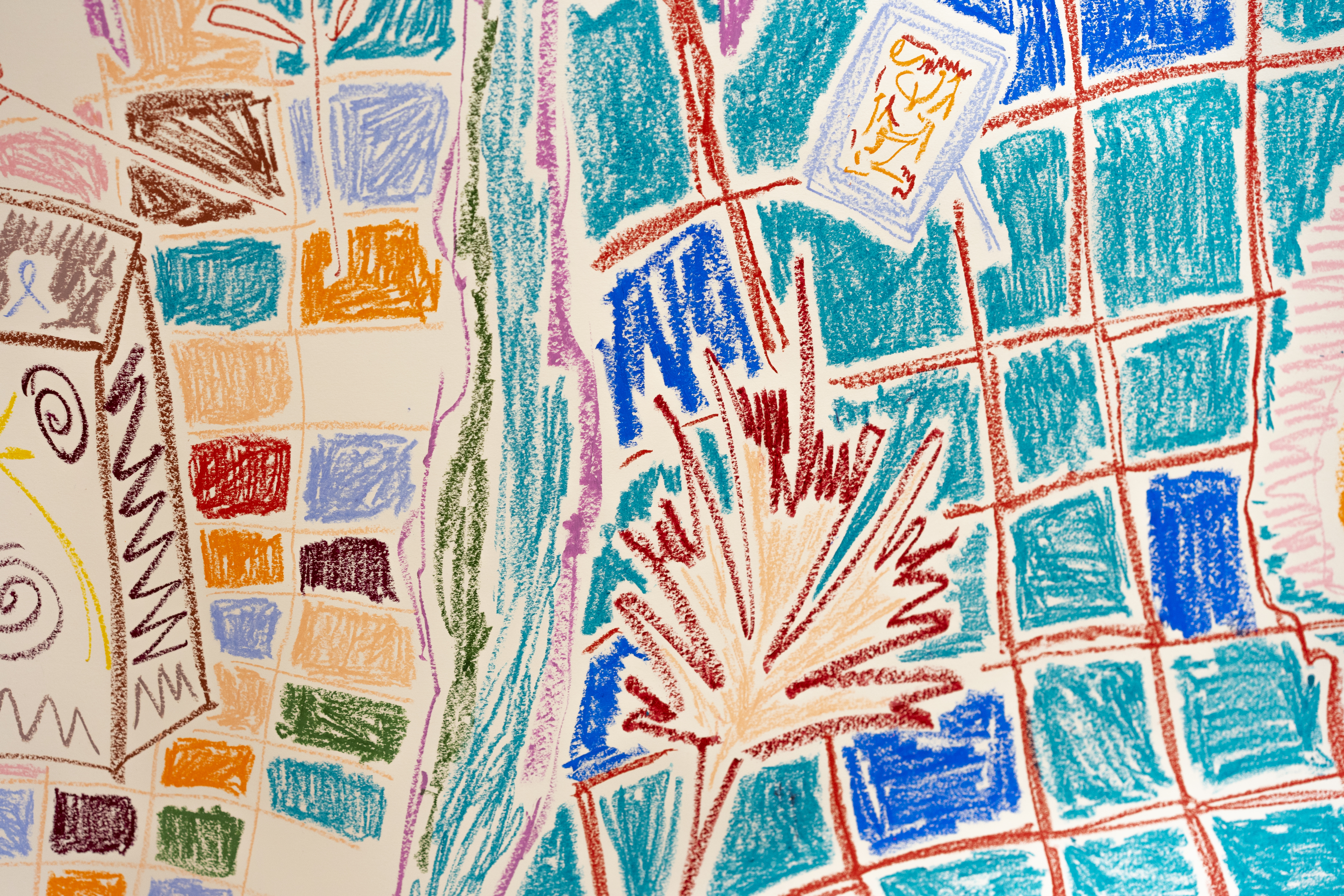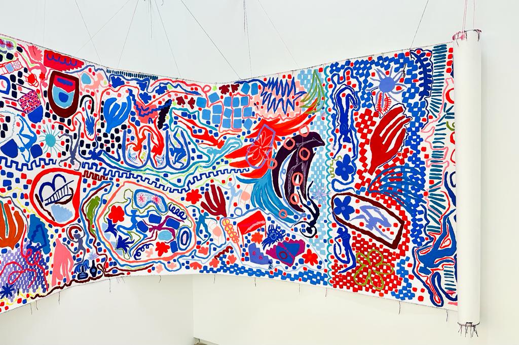 acrylics, oil pastels, thread, 5.5x1.5 m